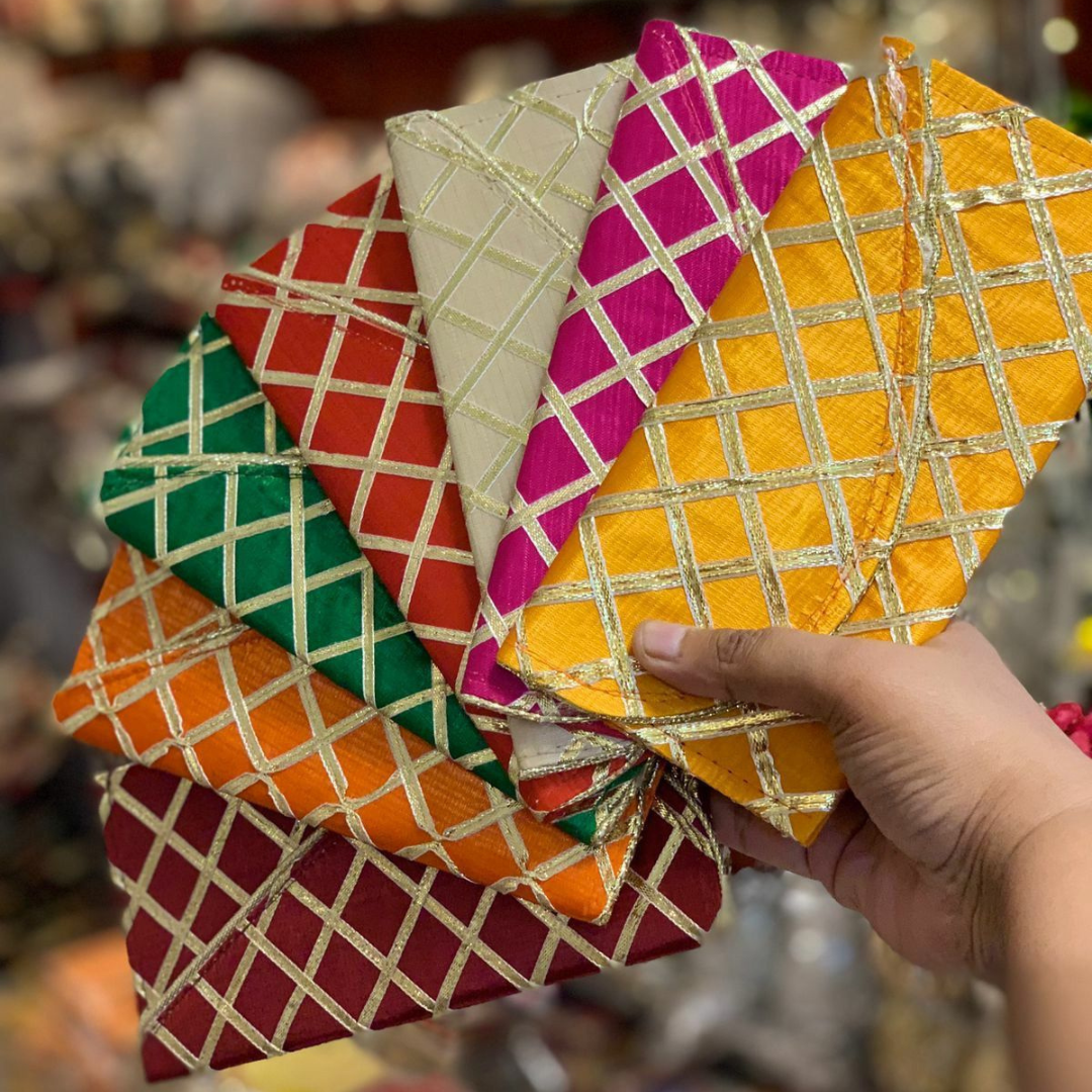 Make your gift-giving more elegant and festive with our handcrafted Gota Patti Envelopes. Made with rich fabric and decorated with golden gota work in a classic checkered design, these envelopes are perfect for weddings, festivals, and special occasions.