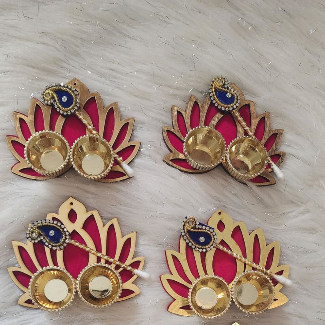 Celebrate your sacred moments with this beautifully designed Lotus Tilak Plate with Stick. Inspired by the purity of the lotus flower, this plate is a stunning blend of tradition and elegance. It includes a matching metal stick for smooth and hygienic tilak application, making it ideal for religious and cultural functions.