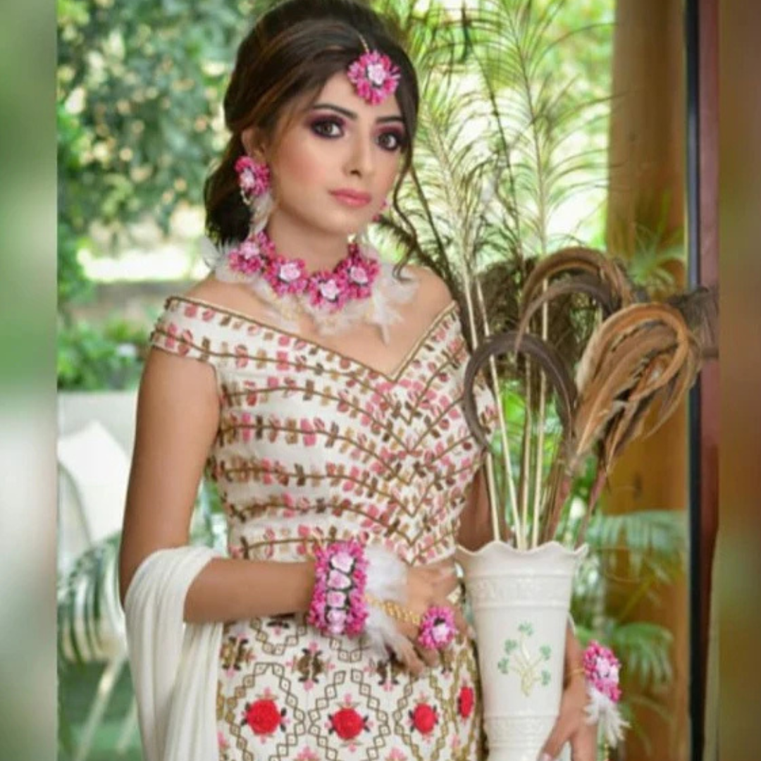 Make your Haldi ceremony even more special with our Pink Floral Feather Haldi Jewellery Set, a perfect blend of elegance and tradition. Designed for brides and bridesmaids who love a soft, feminine touch, this set features intricately handcrafted pink flowers paired with delicate feathers, creating a graceful and ethereal look.