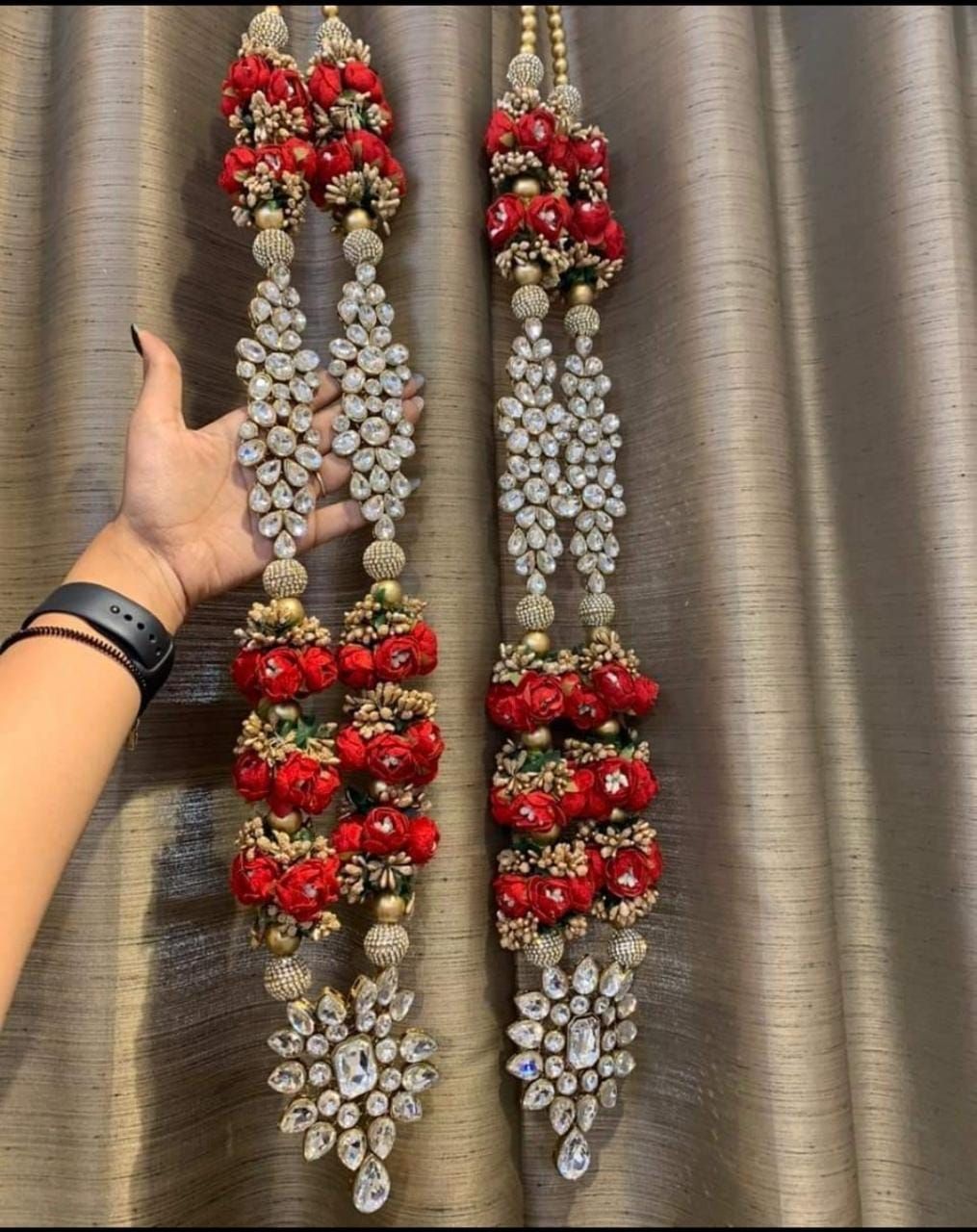 Add a royal touch to your special moment with our Premium Wedding Varmala, beautifully handcrafted using high-quality artificial flowers in rich red and ivory tones. The varmala features golden bead strings, intricate floral arrangements, and elegant kundan stone embellishments that give a luxurious and traditional look.